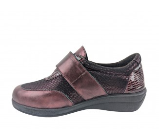 Zapato para mujer de la marca Doctor Cutillas, fabricado en piel y combinado en piel licra grabada al tono con brillo. Forro interior textil técnico suave al tacto y plantilla conformada extraíble. Calce ANCHO ESPECIAL. Cierre de velcro para un ajuste sencillo al pie. Hecho en España por la marca Doctor Cutillas. Referencia----100529 COD:   43518 Color                               Burdeos...