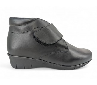 Bonito y cómodo botín de señora con cuña, realizado en piel curtida lisa muy muy suave. Forro textil de primera calidad y piso goma antideslizante. Cierre mediante una tira de velcro en el empeine. Fabricados en España por la marca Valerias. Referencia----200578 COD:   1573 Color                                  Negro Suela                                 Goma Tacón...