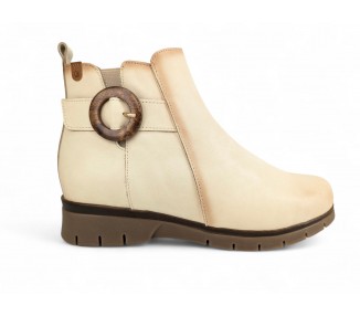 Bonito y comodísimo botín de señora con cuña, realizado en piel curtida lisa muy muy suave. Forro textil afelpado y piso goma antideslizante. Cierre mediante cremallera por la parte interior. Detalle por la parte exterior de botón-Hebilla con elástico. Fabricados por la marca Valerias. Referencia----200625 COD:   2389 Color                                  Beig Suela...