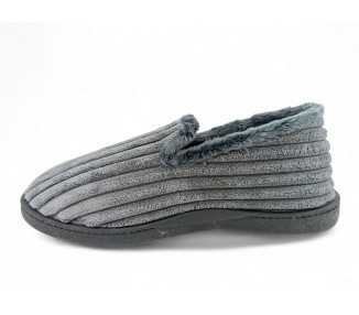 Comodísima zapatilla cerrada de andar por casa para hombre, realizada en material textil  muy acolchado con dibujo de pana clasic. Plantilla extraíble de espuma de PU transpirable de alta recuperación que se adapta completamente a la anatomía del pie. Fabricada en España por la marca Plumaflex. Referencia----61097 COD:    12026 Color                                  Gris Suela...
