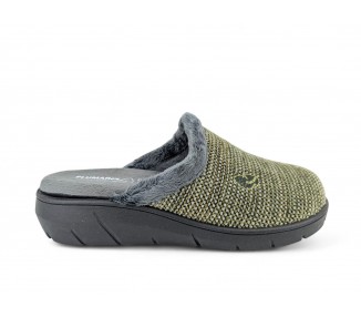 Comodísima zapatilla cerrada de andar por casa para mujer, realizada en material textil con motivos lisos otoñales. Ribete de pelo con plantilla extraíble de espuma de PU transpirable de alta recuperación que se adapta completamente a la anatomía del pie. Fabricada en España por la marca Plumaflex. Referencia----60158 COD:    14236 Color                                  Kaki Suela...
