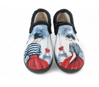 Comodísima zapatilla cerrada de andar por casa para niña y mujer, realizada en material textil con dibujo de chicas con corazón y de con fondo la Torre Eifel. Forro y ribete de pelo. Tiene plantilla extraíble de espuma de PU transpirable de alta recuperación que se adapta completamente a la anatomía del pie. Fabricado en España por la marca Plumaflex. Referencia----60160 COD:    12215 Color...