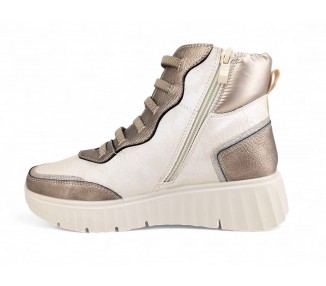 Botín Sport para mujer con cuña media muy confortable, conformado en suave tejido efecto brillos combinado con napa al tono. Interior realizado en material textil técnico muy acolchado y caliente. Es un botín de estilo urbano y actual. Cordonera elástica central para una rápida sujeción al pie y cremallera practicable en el lado interior. Detalle de material brillante en puntera y talón. Cuello...