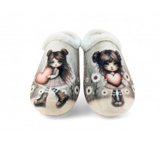 Comodísima zapatilla de andar por casa descalza para mujer y joven. Realizada en textil muy suave y aterciopelado con forro textil afelpado y suela flexible y antideslizante. Ribete de pelo. Motivo en pala de chicas con corazón y fondo de flores. Plantilla extraíble. Fabricado en España por la marca Gema García. Referencia----60176 COD:    7000-30 Color                                  Beig...