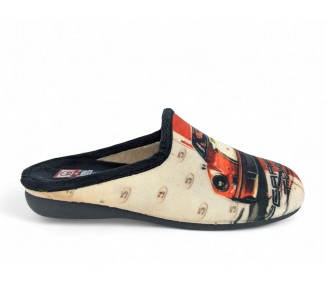 Comodísima zapatilla de andar por casa descalza para hombre y joven. Realizada en textil muy suave y aterciopelado con forro textil afelpado y suela flexible y antideslizante. Ribete de pelo corto. Motivo en palas de coche de carreras con mensaje "Carrera Turbo". Plantilla extraíble. Fabricado en España por la marca Gema García. Referencia----61112 COD:    7005-15 Color...