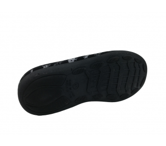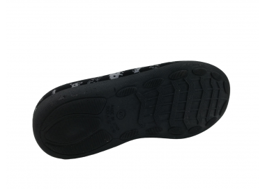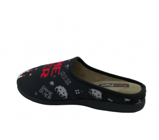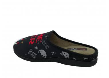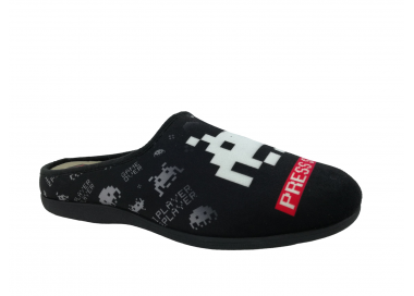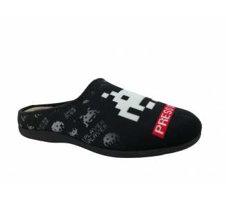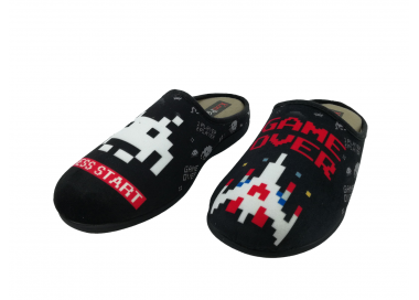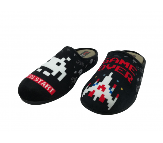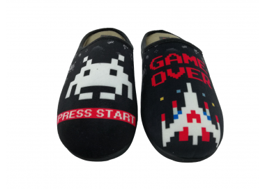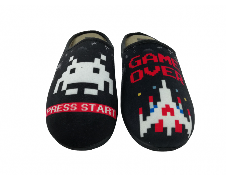 Comodísima zapatilla de andar por casa descalza para hombre, con motivo en pala de asteroide y mensaje de press start en el pie derecho y en el pie izquierdo nave espacial y mensaje game over. Realizada en textil muy suave con forro textil afelpado y suela flexible y antideslizante. Fabricado en España.