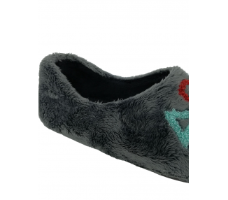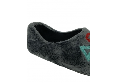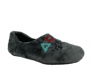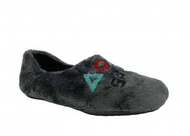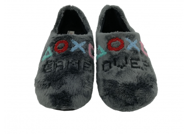 Comodísima zapatilla de andar por casa cerrada para hombre, con motivo en pala de mensaje "Game" con símbolos en el pie derecho y en el pie izquierdo mensaje de "Over" y símbolos. Realizada en textil muy suave con forro textil afelpado y suela flexible y antideslizante. Fabricado en España.