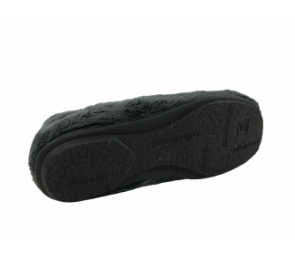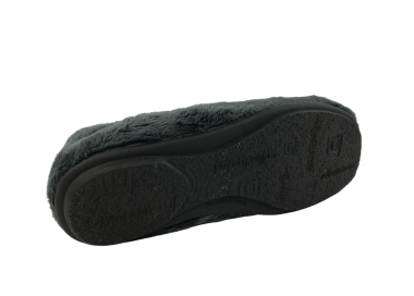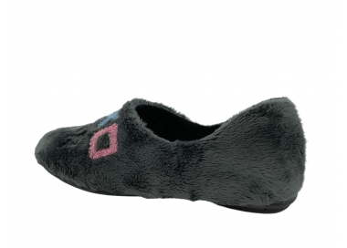 Comodísima zapatilla de andar por casa descalza para mujer y joven. Realizada en textil muy suave y aterciopelado con forro textil afelpado y suela flexible y antideslizante. Ribete de pelo. Motivo en pala de taza de café con mensaje "coffe". Plantilla extraíble. Fabricado en España por la marca Gema García.