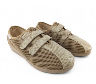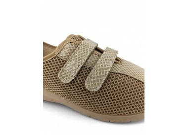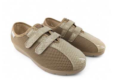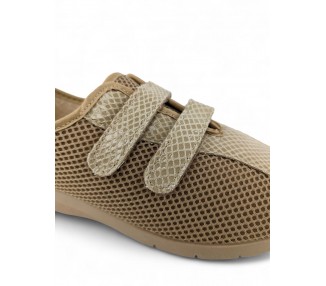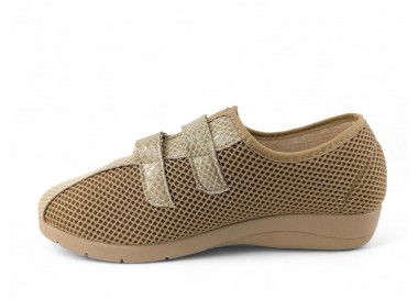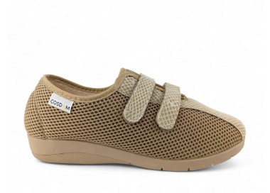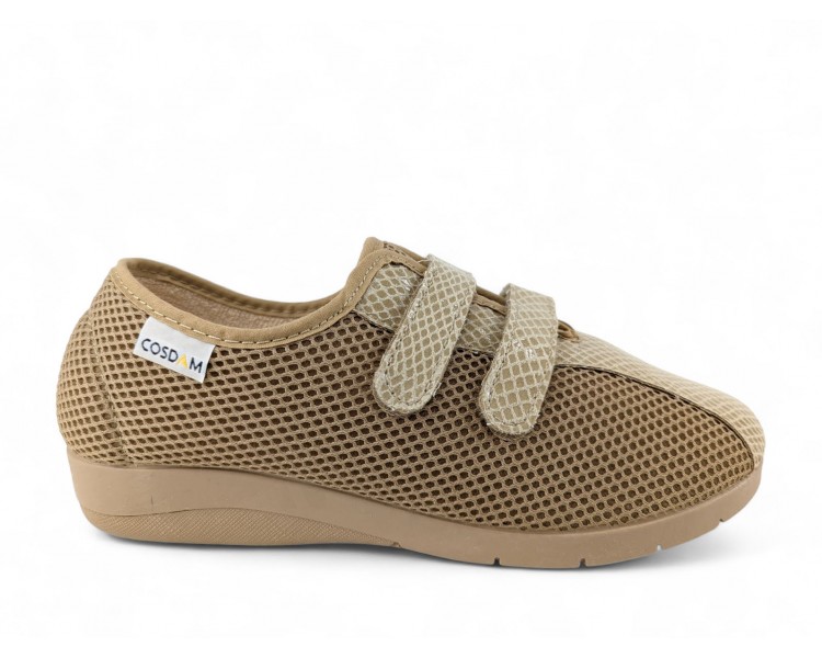 Zapatilla con cuña cómoda de mujer. Se puede utilizar para casa y calle. Realizada en material textil rejilla con cierre de dos velcros frontales. Corte en textil suave con brillo en la boca y las tiras de velcro. Suela antideslizante para mayor seguridad. Fabricado por la marca Cosdam.