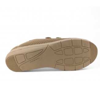 Mocasín de mujer de la marca Carmela. Fabricado en piel de alta calidad con diseño de picados. Antifaz sobre pala. Tirador trasero para facilitar la puesta. Piso deportivo con volumen y suela bicolor de goma antideslizante. Referencia----500418 Cod: 161616 Color Camel Suela Goma Tacón Cuña...