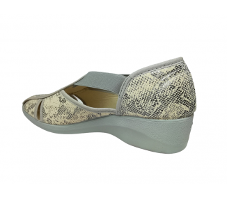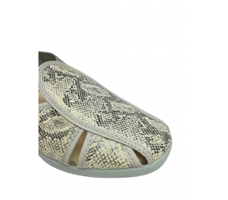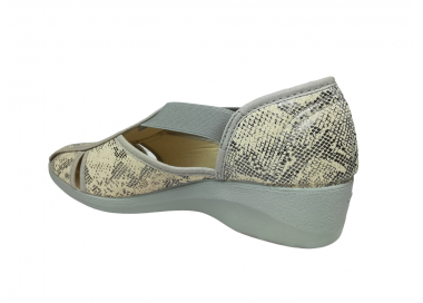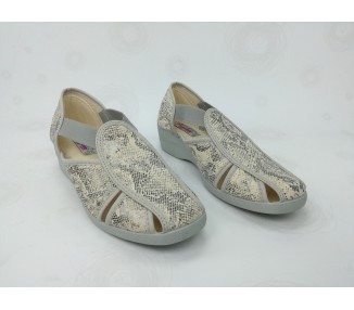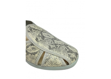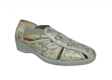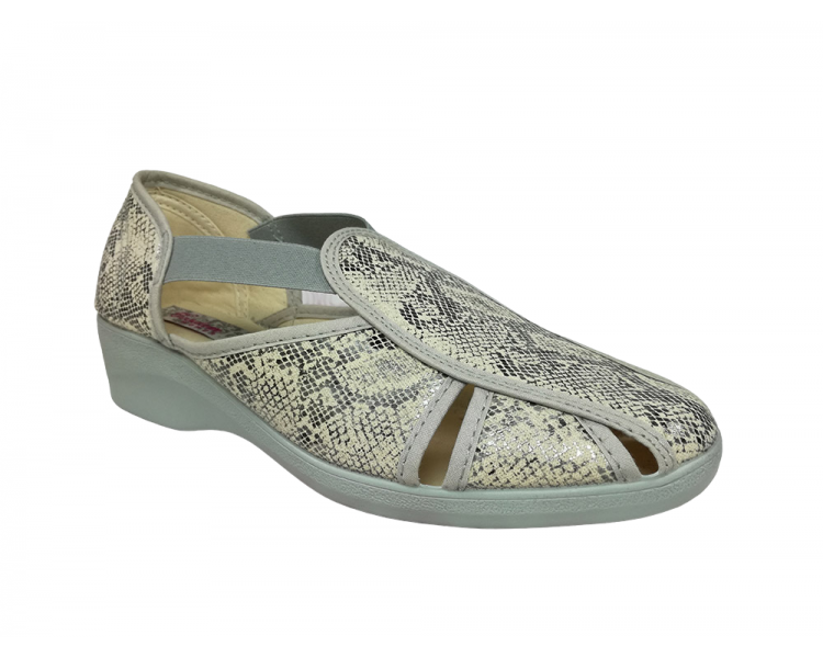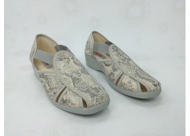Zapatilla abierta de Cosdan para mujer. Realizada en material textil metalizado. Dispone de aberturas laterales y suela de goma flexible. Sujeción mediante elásticos laterales que facilitan y agilizan el calce del pie.