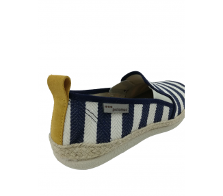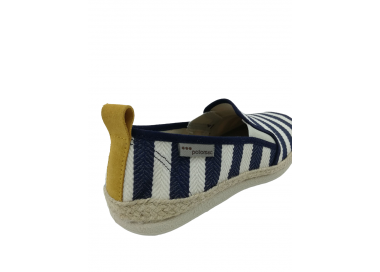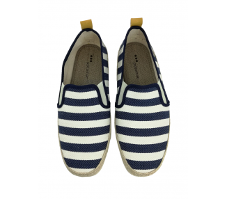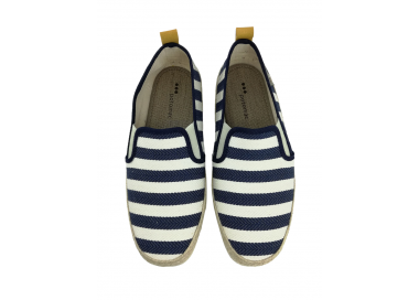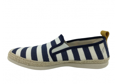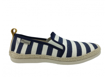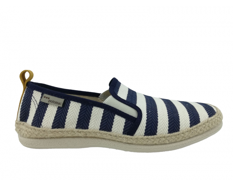 Esta zapatilla combina calidad, comodidad y diseño exclusivo. Zapatillas vulcanizadas de algodón 100% orgánico y tintadas por métodos tradicionales no contaminantes y terminación estampada de rallas marineras. Piso de goma flexible y vira de yute natural. Detalle en contrafuerte de piel serraje. ¡¡ Muy veraniega ¡¡.Hecho por la marca Potomac.