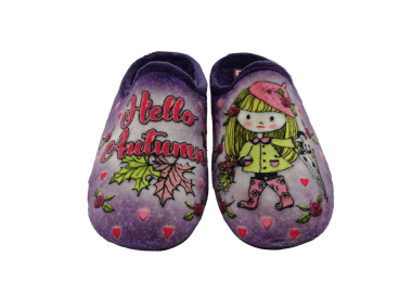 Zapatilla de andar por casa descalza para mujer y joven, con mensaje de hello autunm y dibujo de niña con paragüas. Realizada en textil muy suave y aterciopelado con forro textil afelpado y suela flexible y antideslizante. Plantilla extraíble. Fabricado en España por Gema García.