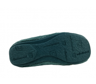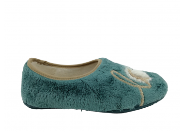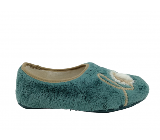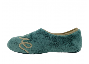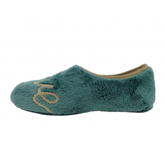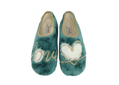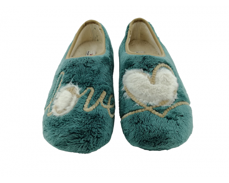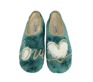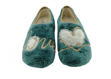 Zapatilla cerrada de andar por casa para mujer. Fabricada en un suave tejido invernal con original dibujo de corazón en el pie izquierdo y de mensaje “Love” en el pie derecho. Forro interior aterciopelado muy suave y cálido. Suela de caucho natural antideslizante. Fabricado en España por la marca Vul-ladi.