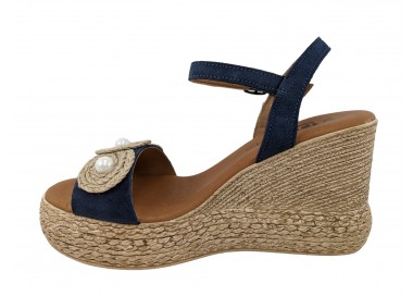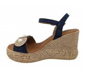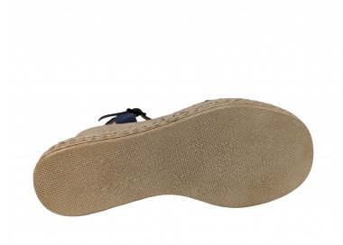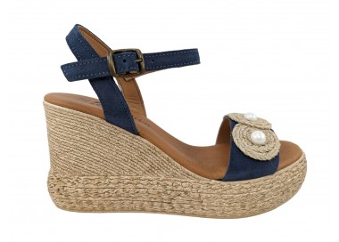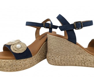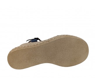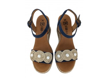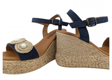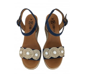 Sandalia con plataforma para mujer, realizada totalmente en piel serraje. Pala de una sola tira con adornos de tres moñas de esparto con una perlita. Cierre de pulsera y planta piel de gel para mayor comodidad. Piso imitación esparto de mínimo peso. Fabricado por la marca Xqsi.