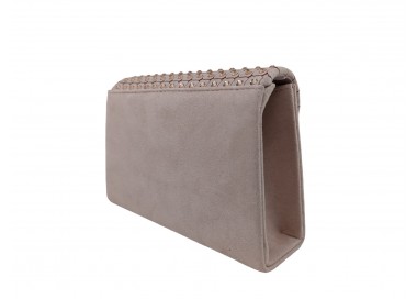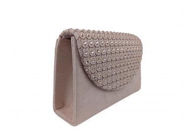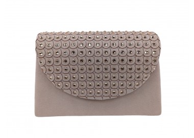 Cartera de fiesta de mano realizada en ante sintético. Tapa con detalle de círculos superpuestos y piedritas brillantes. Cierre de imán, caja rígida y cadena larga para llevar colgado. Interior con un solo bolsillo.