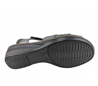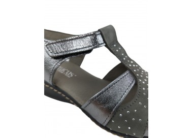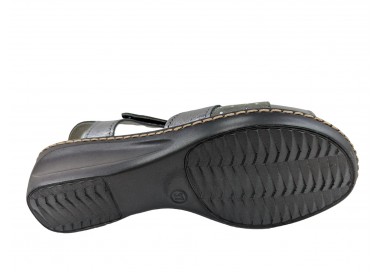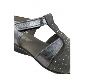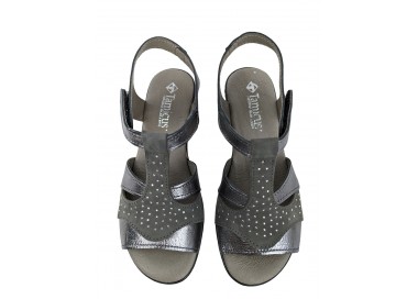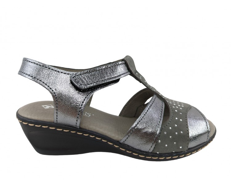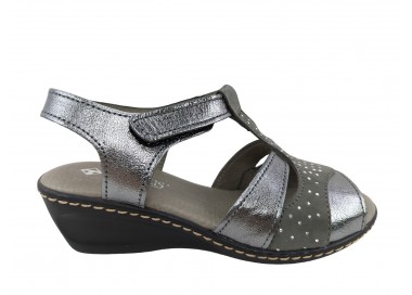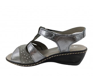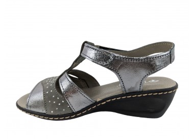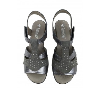 Sandalia para mujer elaborada con pieles combinadas de gran calidad. Pala realizada con 3 piezas combinadas y unidas a su vez al a la trabilla. Cuenta con cierre de velcro en el lateral exterior. La sandalia presenta una abertura en la parte frontal dejando los dedos del pie al descubierto. Forro interior de piel y plantilla acolchada y blanda. Fabricado por la marca Tamicus.