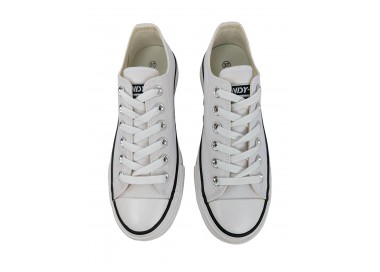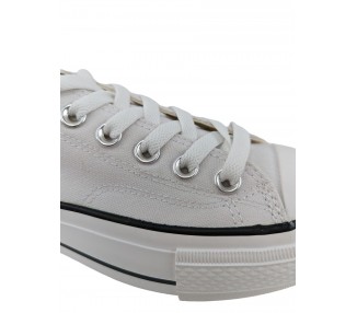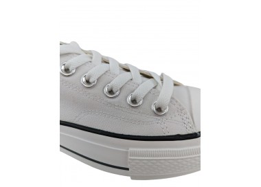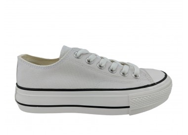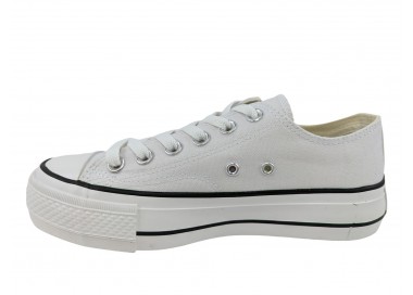 Zapatilla con plataforma para mujer de la marca Andy-z, realizada en lona con forro interior textil y puntera de goma en color blanco. Cordonera central de ojales metálicos. La suela de doble piso es de goma, con lo que ganará en adherencia al suelo.