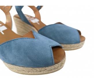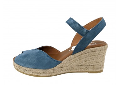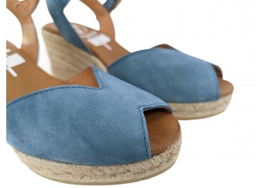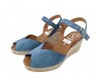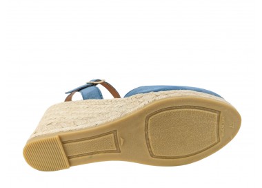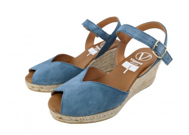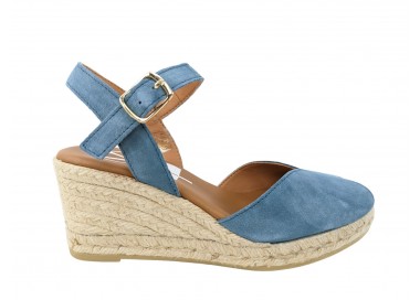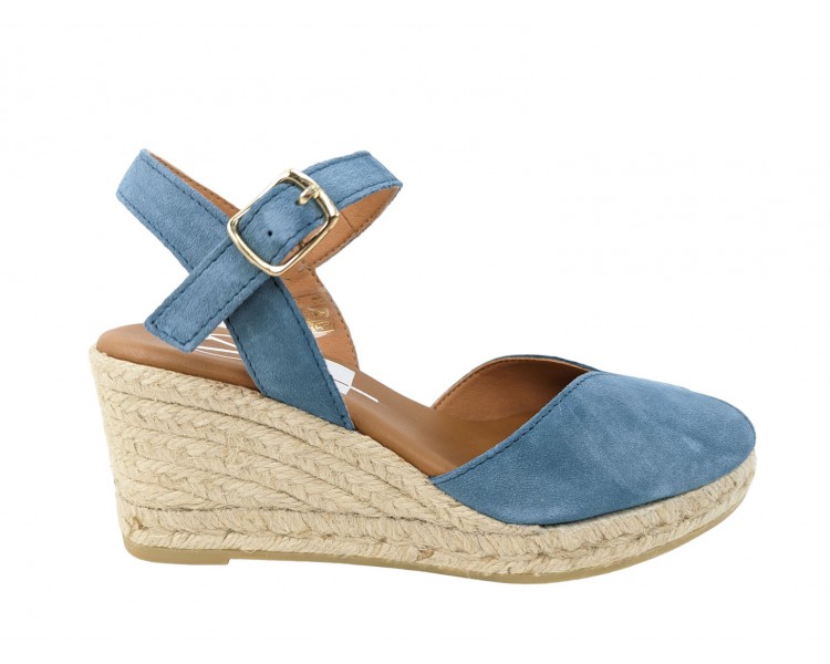 Alpargata para mujer y joven, fabricada en piel serraje con la pala en corte en V. Puntera abierta con pulsera tobillera y hebilla regulable que le proporciona una correcta sujeción. Planta de piel muy acolchada de gran confort y suavidad. Cuña de yute y suela de goma para mayor agarre. Hecho por la marca Viguera.