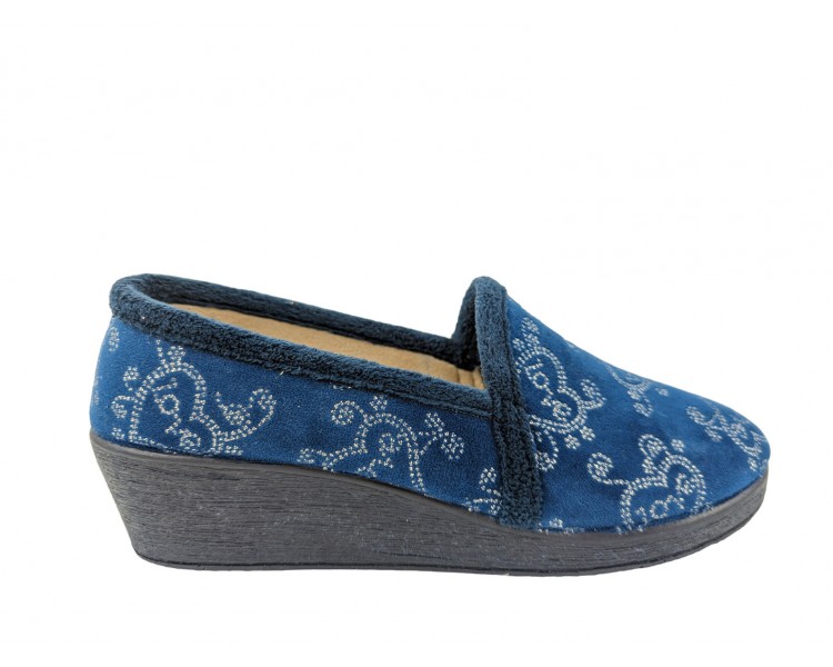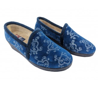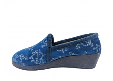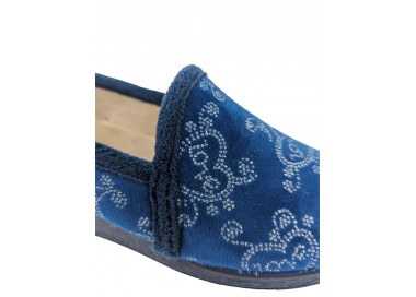 Comodísima zapatilla de andar por casa cerrada para mujer. Realizada en textil muy suave y aterciopelado con motivo de corazones y mensaje "love". Forro textil afelpado y suela flexible y antideslizante. Plantilla muy acolchada. Fabricado en España por la marca Gema García.
