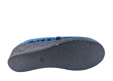 Zapato con cuña para mujer, fabricado con hilo grueso trenzado, con acabado satinado de colores. Copete con cierre en forma de V. Cuña media de 5 cm con plataforma de 2 cm de mínimo peso. Plantilla extraíble realizada en materia técnico muy acolchada. Fabricado en España por la marca Nival.
