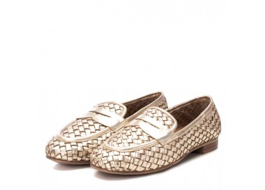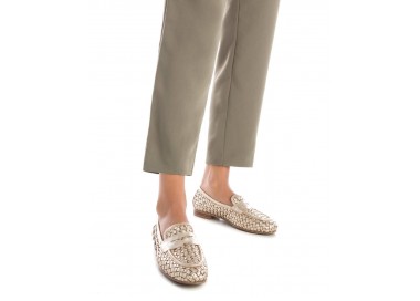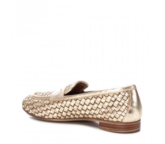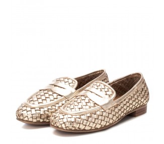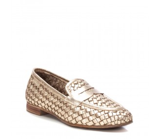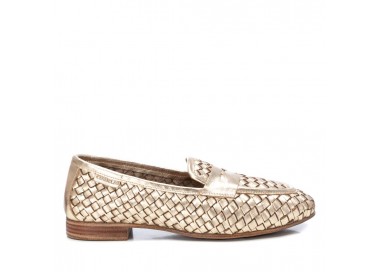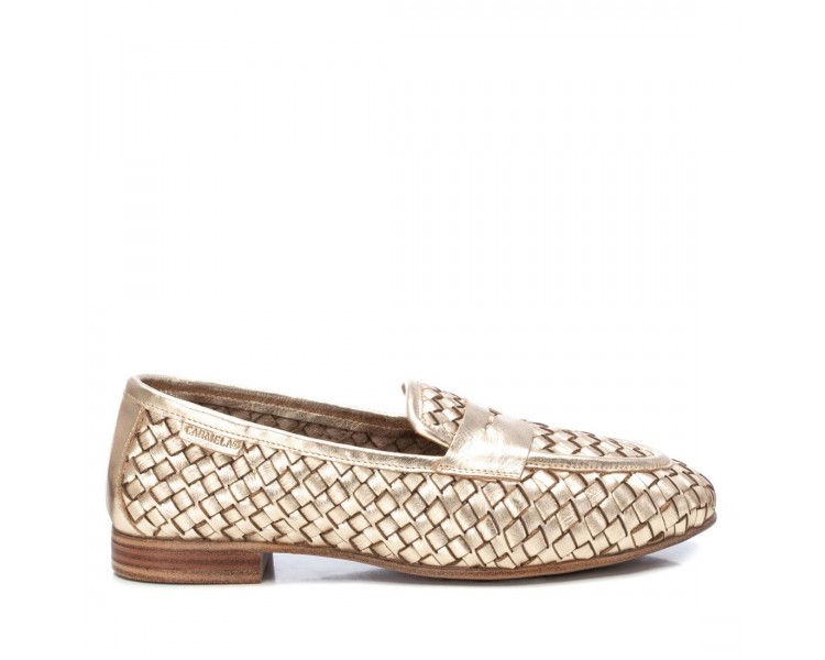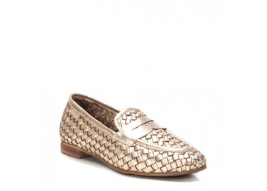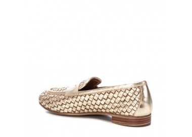 Zapato mocasín de piel trenzada en color oro con punta redondeada. Forro de piel. Plantilla de piel acolchada de látex para un mayor confort. Piso flexible. Fabricado por la marca Carmela.
