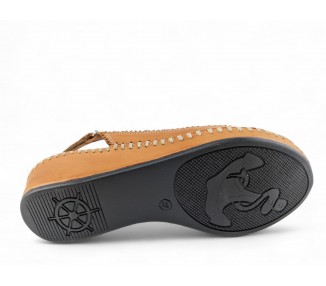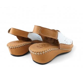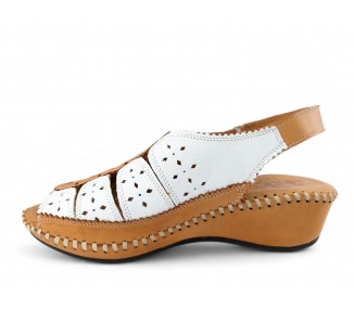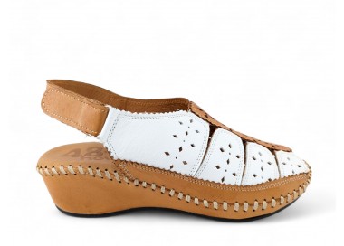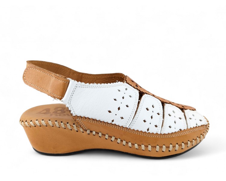 Sandalia maxi confort para mujer con cuña, realizada en piel de primera calidad súper suave, con cierre mediante pulsera con velcro que facilita su calce y ajuste al pie. Talón y puntera abiertos. Detalles calados sobre la pala y suela cosida al corte con detalle de pespunte visto en contraste. Hecho por la marca 48 Hours.