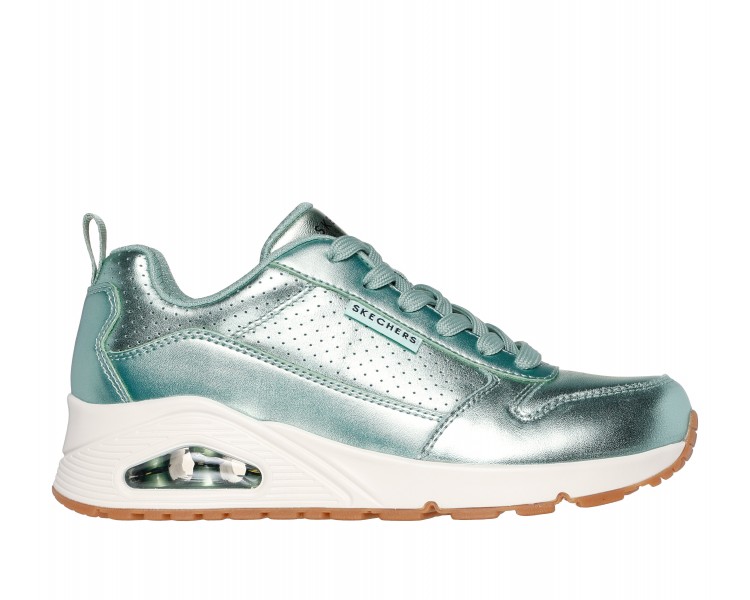 Brilla a la moda sin renunciar a la comodidad con Skechers Street™ Uno - Metallixs. Esta zapatilla con cordones cuenta con una parte superior de piel con acabado metálico, una plantilla Skechers Air-Cooled Memory Foam® y media suela visible Skech-Air® con cámara de aire.