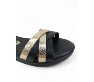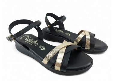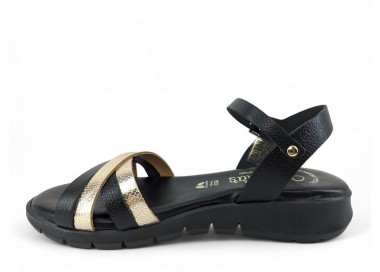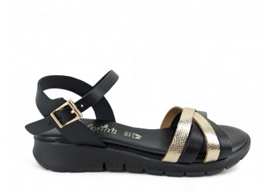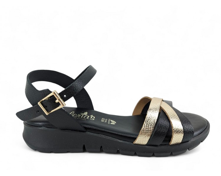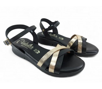 Sandalia confort de la marca Valerias para mujer, formada por tiras grabadas cruzadas en la pala de piel metal y pulsera tobillera de piel con cierre de hebilla regulable. Cuña de altura cómoda muy actual. Forro de piel y plantilla de piel muy muy acolchada de gran comodidad.