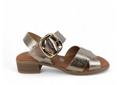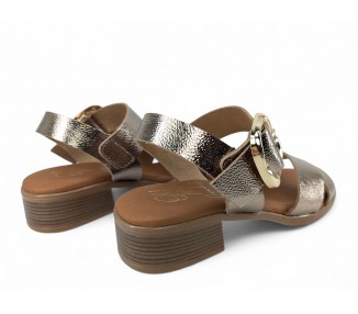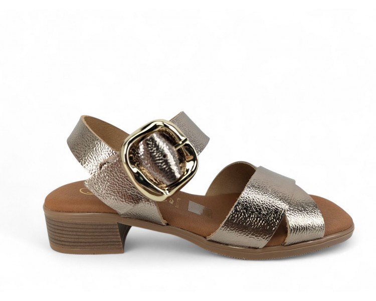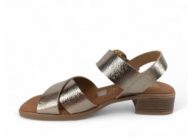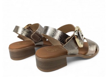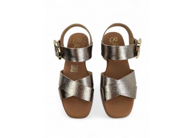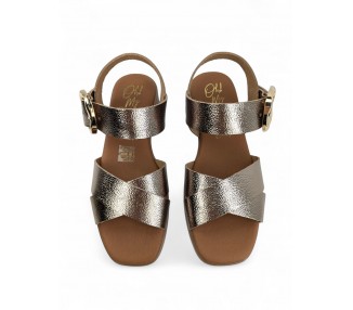 Sandalia de mujer y joven realizada en piel bombeada con terminación metalizada de máxima calidad. Dos tiras anchas cruzadas en pala. Tira tobillera de cierre con una bonita hebilla regulable. Tacón medio más que cómodo. Máxima comodidad con su planta de gel acolchada. Fabricado por la marca Oh My Sandals.