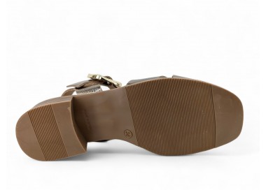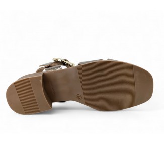 Sandalia para mujer y joven con tacón medio-bajo cómodo realizada en piel bombeada de primera calidad. Cierre con hebilla para un perfecto ajuste al pie. Detalle de tachas doradas en la tira de la pala y del empeine. Planta de gel de gran comodidad. Hecho por la marca Chika10.