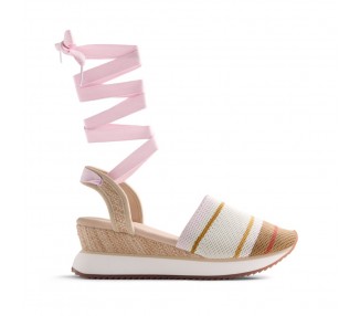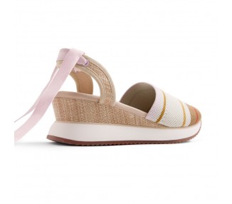 Zapatillas valencianas destalonadas con cuña de rafia. Estampado de rayas con contrastes de color. Cuentan con planta acolchada. Atadas con lazos. Altura cuña: 5,5 cm. Corte de rafia y poliéster transpirable. Forro de poliéster transpirable reciclado. Planta de poliéster poliuretano. Entresuela de EVA ligera. Suela de TPR. Certificaciones: Global Recycled Standard.