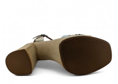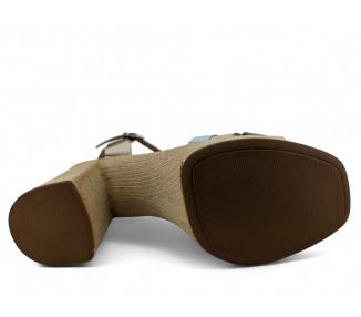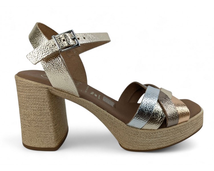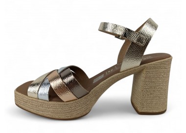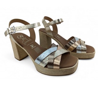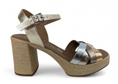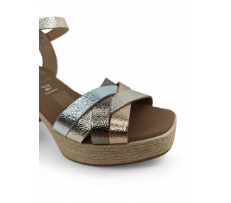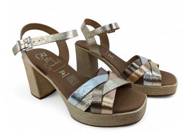 Sandalia de mujer y joven realizada en piel bombeada con terminación metalizada de máxima calidad. Pala realizada con varias tiras entrelazadas entre si. Cierre con una hebilla regulable. Plataforma cómoda y tacón ancho que imita yute. Máxima comodidad con su planta de gel acolchada. Fabricado por la marca Oh My Sandals.