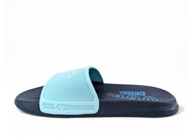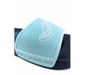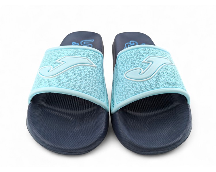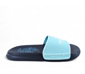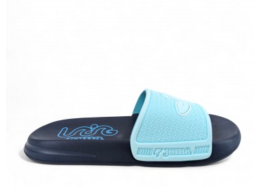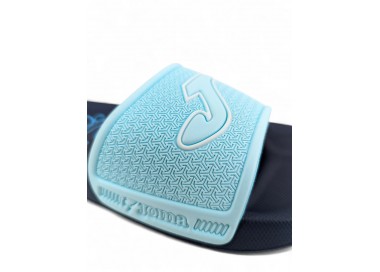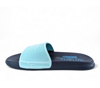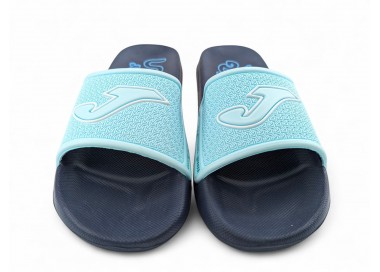 Chancla deportiva de mujer y joven ultraligera con adorno de figuras geométricas en el empeine y serigrafía de la marca Joma en color turquesa. Planta anatómica para más comodidad y forro textil en interior del empeine. Suela resistente a la abrasión. Ideal para la playa, piscina y también para casa. Hechas por la marca Joma.