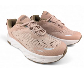 Zapato Sport para mujer con cuña alta y confortable, realizado en suave tejido vegano combinado con napa satinada bombeada en contraste. Interior realizado en material textil técnico y cuello acolchado. Plantilla extraíble. Es un zapato de estilo urbano y actual. Cordonera elástica central con brillo metalizado oro y para una rápida sujeción al pie. Hecho por la marca Mysoft....