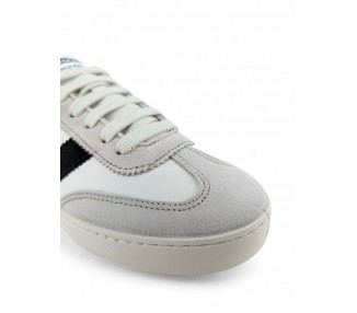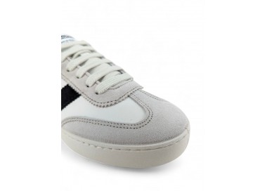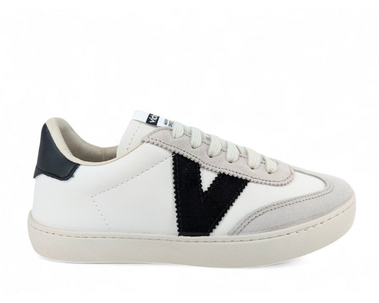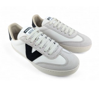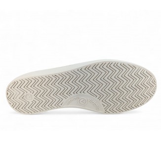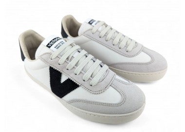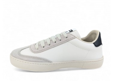 Zapatillas blancas fabricadas en España en material efecto piel y piezas de serraje. Detalles de color en la V del lateral y la trasera, y nuevo corte ciclista en la puntera aportando estilo. Su suela ligeramente tostada está compuesta por aceites vegetales en lugar de minerales reduciendo así el impacto medioambiental. Además, incluyen una plantilla más ergonómica, confeccionada a partir de materiales reciclados, proporcionando un confort superior en cada paso. Fabricado por la marca Victoria.