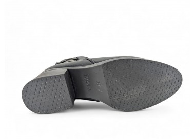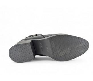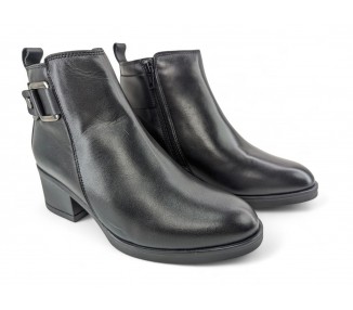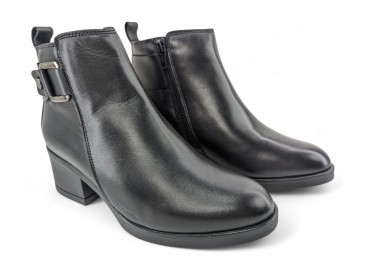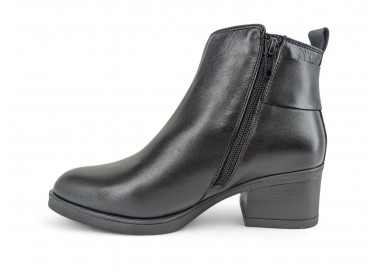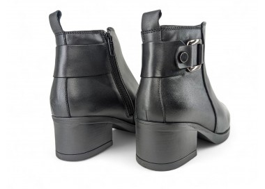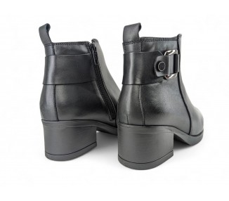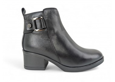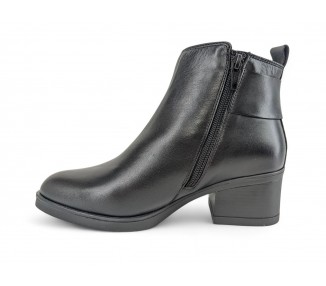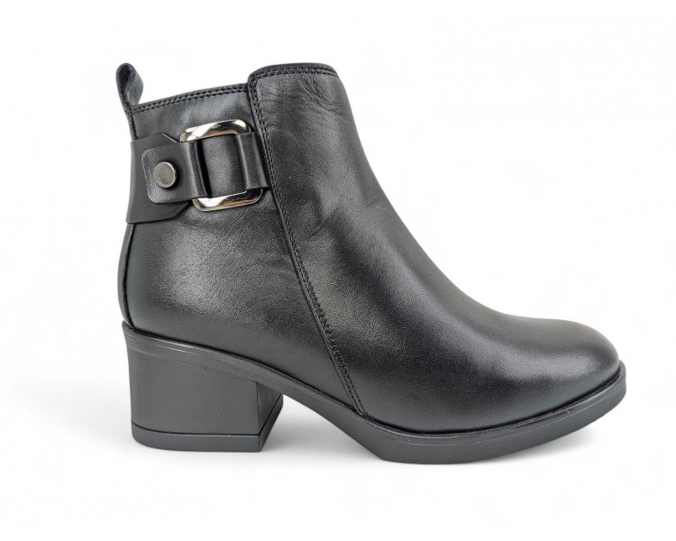 Bonito y cómodo botín de señora con tacón, realizado en piel lisa muy muy suave. Forro textil técnico y piso goma antideslizante. Tacón ancho y cómodo con una altura muy ponible. Cierre mediante cremallera lateral. Detalle de herraje metálico con forma de argolla en metal plata vieja en lo alto de la caña. Fabricados por la marca Kaola.