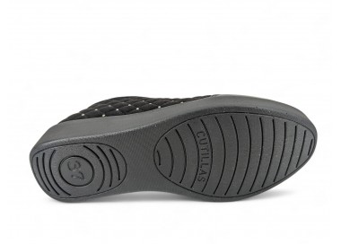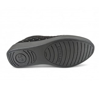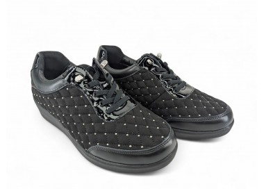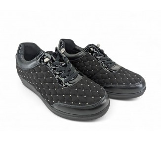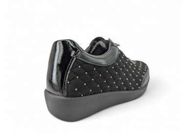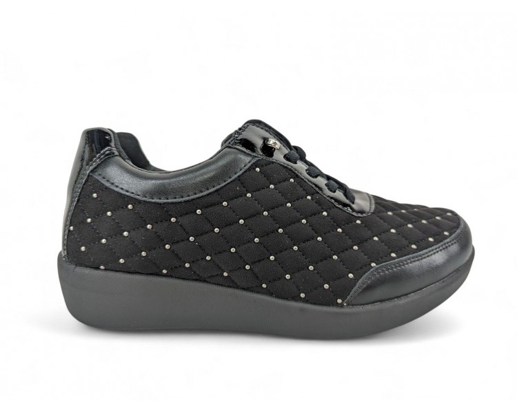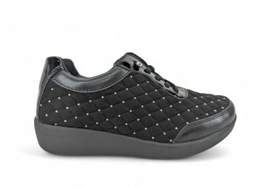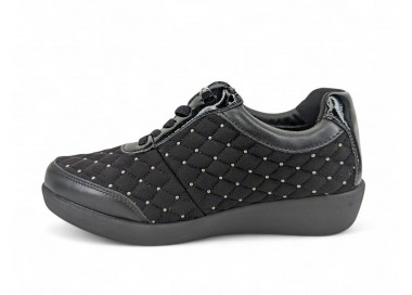 Zapato Sport para mujer, conformado en suave tejido acolchado con detalle de tachas metálicas combinado con napa brillo al tono. Interior realizado en material textil técnico y cuello muy acolchado. Es un zapato de estilo urbano y actual. Cierre mediante cordón elástico ajustable para una rápida sujeción al pie. Hecho por la marca Doctor Cutillas.