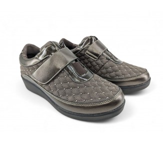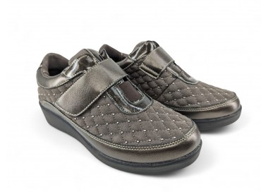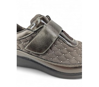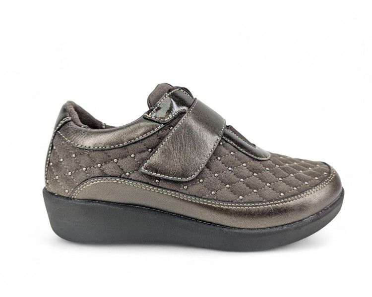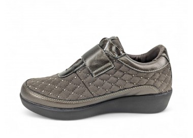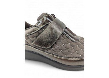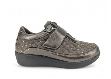 Zapato Sport para mujer, conformado en suave tejido acolchado con detalle de tachas metálicas combinado con napa brillo al tono. Interior realizado en material textil técnico y cuello muy acolchado. Es un zapato de estilo urbano y actual. Cierre de velcro ajustable en la parte alta del empeine para una rápida sujeción al pie. Hecho por la marca Doctor Cutillas.