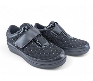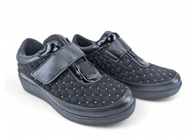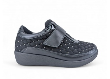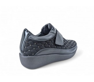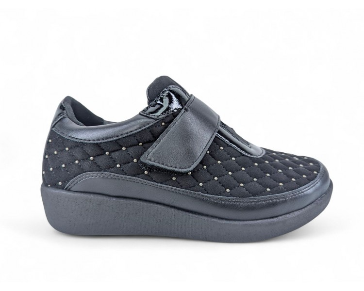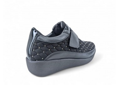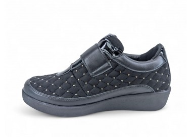 Zapato Sport para mujer, conformado en suave tejido acolchado con detalle de tachas metálicas combinado con napa brillo al tono. Interior realizado en material textil técnico y cuello muy acolchado. Es un zapato de estilo urbano y actual. Cierre de velcro ajustable en la parte alta del empeine para una rápida sujeción al pie. Hecho por la marca Doctor Cutillas.