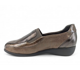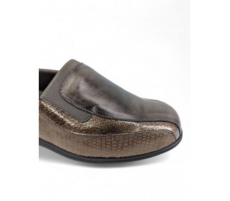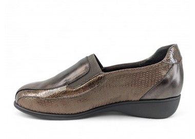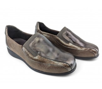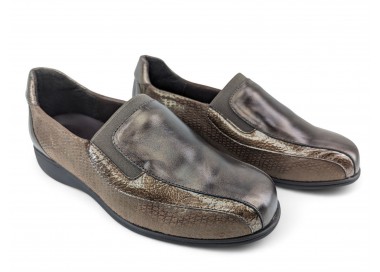 Zapato para mujer de la marca Doctor Cutillas, fabricado en piel y combinado en piel licra grabada al tono con brillo. Forro interior textil técnico suave al tacto y plantilla conformada extraíble. Calce ANCHO ESPECIAL. Cierre de velcro para un ajuste sencillo al pie. Hecho en España por la marca Doctor Cutillas.