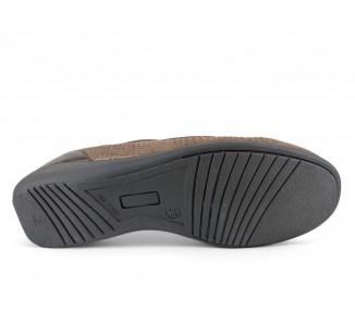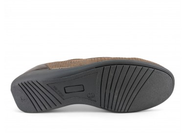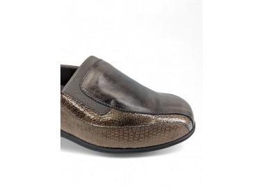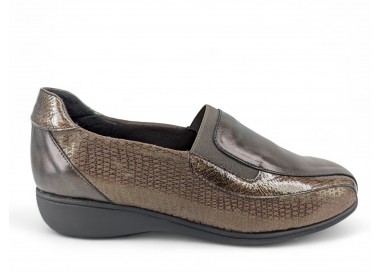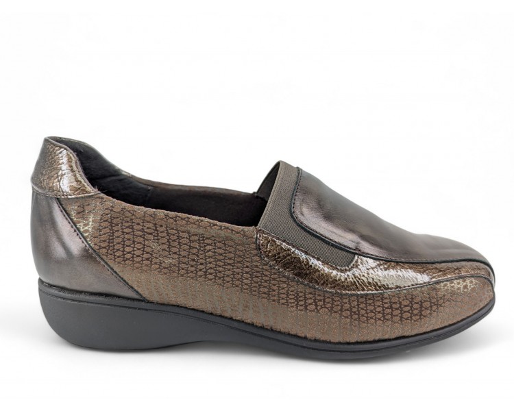 Zapato para mujer de la marca Doctor Cutillas, fabricado en piel y combinado en piel licra grabada al tono con un poco de brillo. Forro interior textil técnico suave al tacto y plantilla conformada extraíble. Calce ANCHO ESPECIAL. Cierre de elásticos para un ajuste sencillo al pie. Fabricado en España.