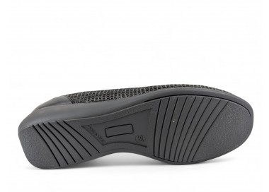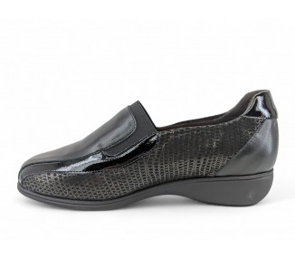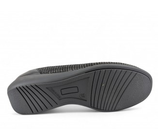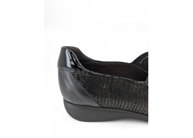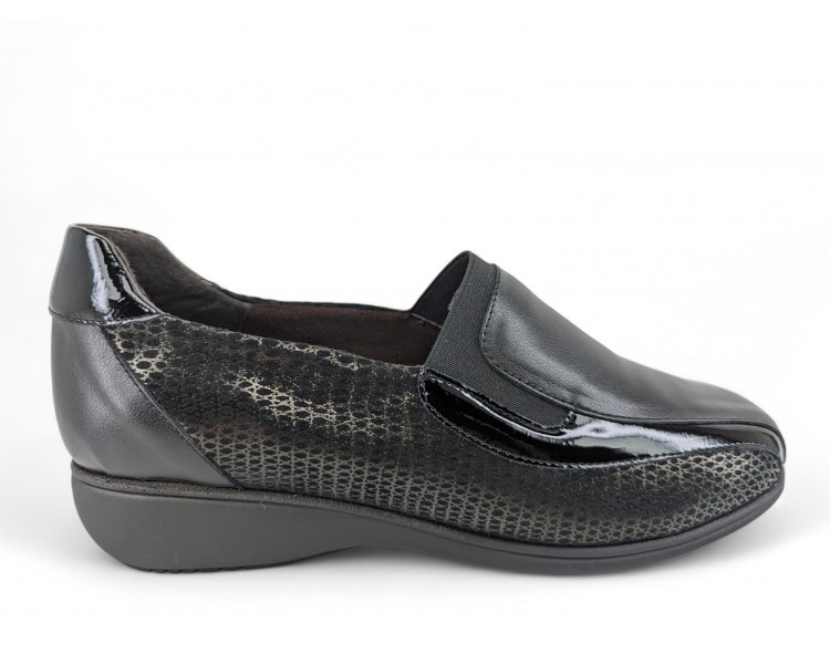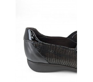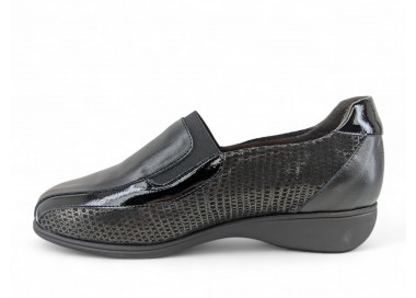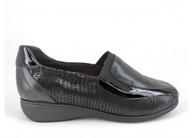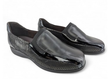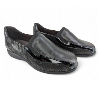 Zapato para mujer de la marca Doctor Cutillas, fabricado en piel y combinado en piel licra grabada al tono con un poco de brillo. Forro interior textil técnico suave al tacto y plantilla conformada extraíble. Calce ANCHO ESPECIAL. Cierre de elásticos para un ajuste sencillo al pie. Fabricado en España.