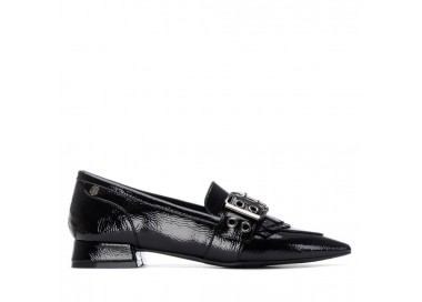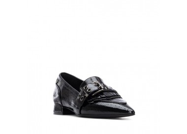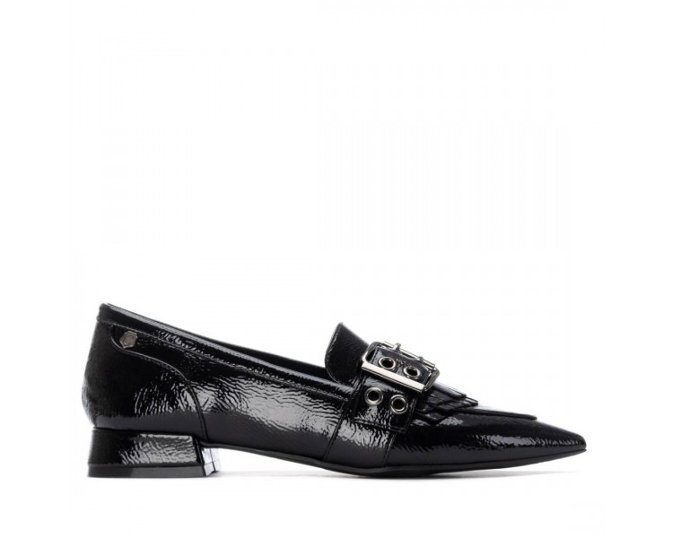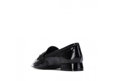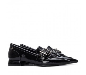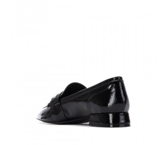 Zapato mocasín de mujer y joven, realizado en charol de primera calidad muy suave. Adorno en pala de hebilla decorativa en color plata vieja y flecos al tono. El forro y la plantilla son de material técnico. Tacón Forrado al tono. Suela de goma antideslizante y plantilla extraíble.