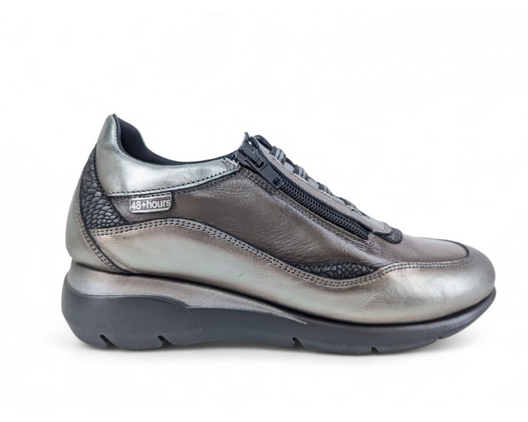 Zapato de mujer realizado en piel de primera calidad. Forro de material técnico combinado con textil. Combinación de pieles en tonos actuales. Suela con cuña de goma flexible y antideslizante. Cierre mediante bandas elásticas y cremallera lateral practicable para un perfecto ajuste al pie. Plantilla muy acolchada. Fabricado por la marca 48 Hours.