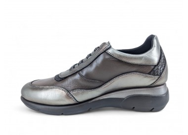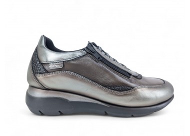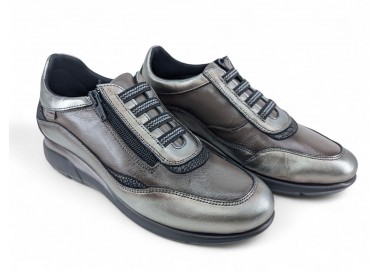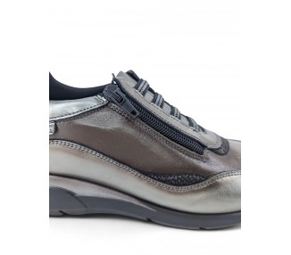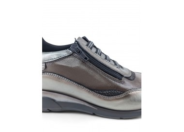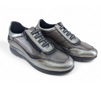 Zapatilla de mujer de la marca Carmela fabricada en piel de alta calidad. Lateral y puntera de rejilla. Combinación de color y pieles en contraste. Suela de goma antideslizante. Plantilla anatómica extraíble para un mayor confort. Cierre con cremallera por el frente.