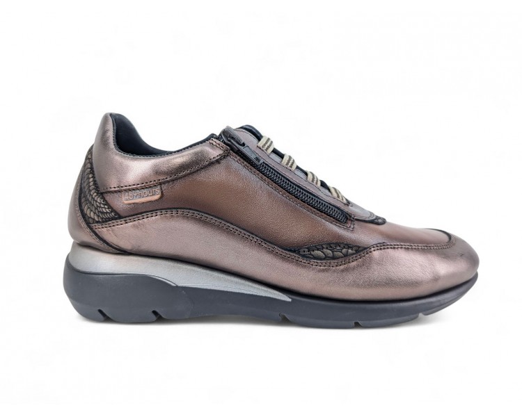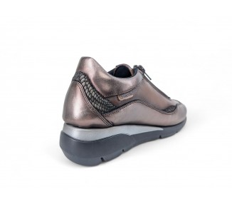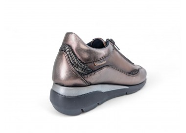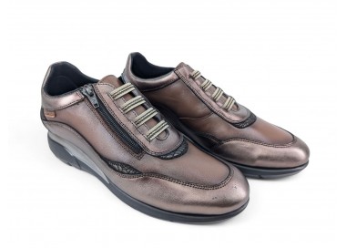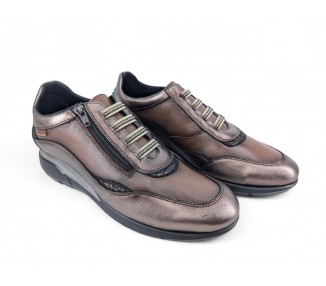 Zapato de mujer realizado en piel de primera calidad. Forro de material técnico combinado con textil. Combinación de pieles en tonos actuales. Suela con cuña de goma flexible y antideslizante. Cierre mediante bandas elásticas y cremallera lateral practicable para un perfecto ajuste al pie. Plantilla muy acolchada. Fabricado por la marca 48 Hours.