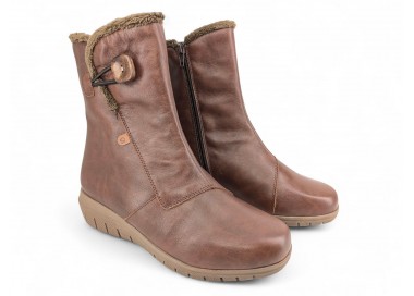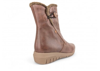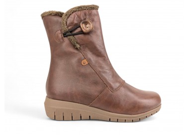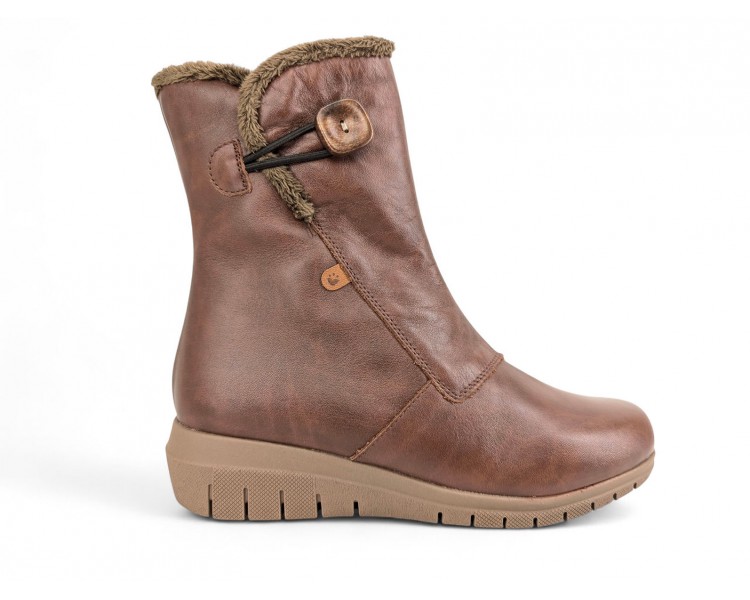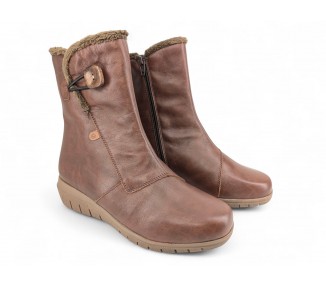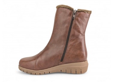 Bonito y cómodo botín de tipo confort para señora con cuña, realizado en piel curtida bombeada muy muy suave. Forro textil de primera calidad muy afelpado y piso goma antideslizante. Plantilla extraíble y conformada. Cierre mediante cremallera por el costado exterior de la pala. Hechos por la marca Nival.