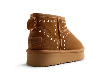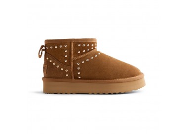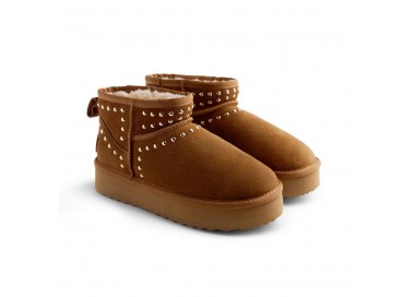 Botas de piel serraje estilo australianas con plataforma y tachas en acabado dorado. Cuentan con forro interior de pelo y plantilla acolchada de pelo. Altura plataforma: 4,5 cm. Fabricadas por la marca Gioseppo.