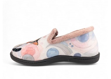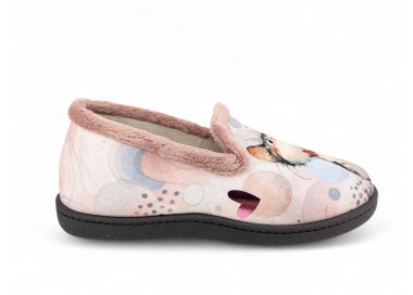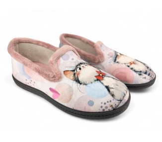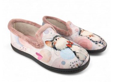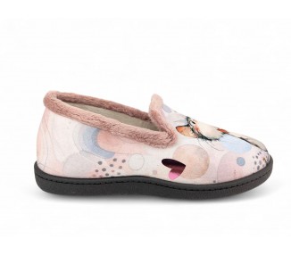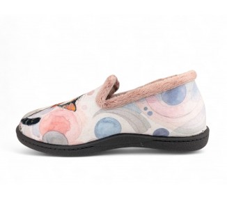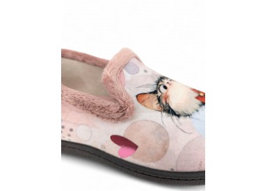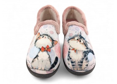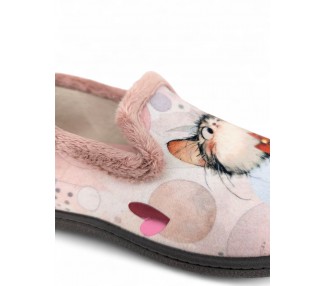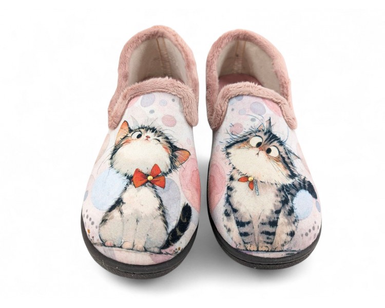 Comodísima zapatilla cerrada de andar por casa para niña y mujer, realizada en material textil con dibujos de dos gatos sobre fondo de círculos y corazones. Forro y ribete de pelo. Tiene plantilla extraíble de espuma de PU transpirable de alta recuperación que se adapta completamente a la anatomía del pie. Fabricado en España por la marca Plumaflex.
